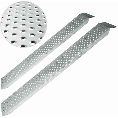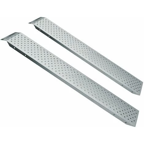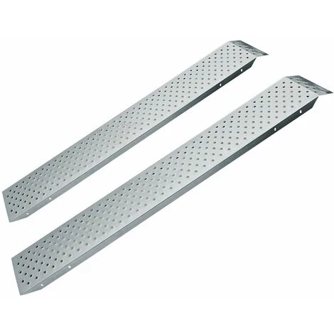 Mit dem hochwertigen Auffahrrampen-Set aus stabilem Stahl ist das Verladen von schweren und großen Geräten ein Kinderspiel und schont somit Ihren Rücken und Ihre Gesundheit. Die rutschfeste und perforierte Oberfläche der Auffahrrampe macht das Abrutschen Ihres Fahrzeugs unmöglich. Die Auflageenden der Auffahrrampe sind mit einer abgeschrägten Auflagefläche versehen, was für reichlich Stabilität sorgt und verhindert ein Verrutschen von Rampe und Fahrzeug. Die Auffahrrampe kann je Schiene bis zu 200kg, also insgesamt 400kg, belastet werden. Dank des geringen Eigengewichts von je 6kg lässt sich die Rampe einfach transportieren.