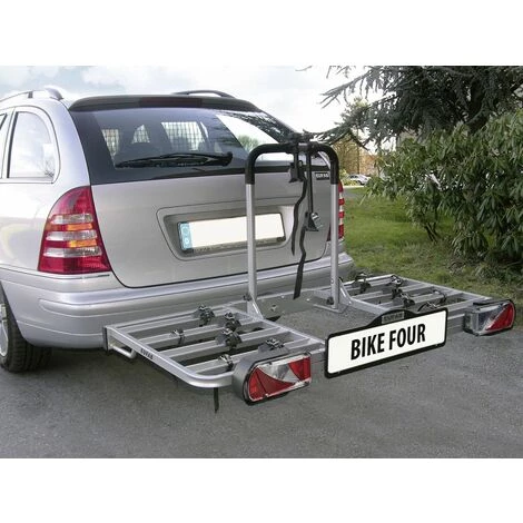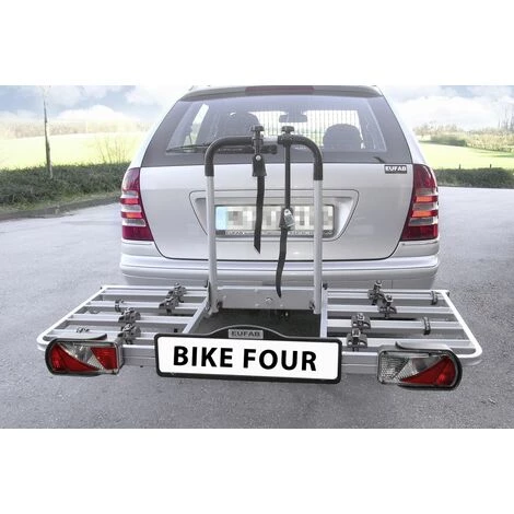 Der Fahrradträger Bike Four von Eufab ist für den Transport auf der Anhängerkupplung von maximal 4 Fahrrädern konzipiert. Schienenlast: Schiene 1: 25 kg Schiene 2: 25 kg Schiene 3: 15 kg Schiene 4: 15 kg (aber max. Nutzlast 70 Kg)Montage auf der Anhängerkupplungfür 4 Fahrräder, E-Bike geeignetSchnellverschluss: neinAbklappmechanismus: neinmax. Nutzlast: 70 kgEigengewicht: ca. 20 kgHöchstgeschwindigkeit: 130 km/hAnzahl der Räder: 4Befestigung der Fahrräder: Rahmenhalter und Radstopper mit Textilspanngurtstabile V-Schienen aus StahlSchienenabstand: ca. 16 cmRadstand: max. 120 cmmax. Reifenbreite in der Schiene: bis 2,2 ZollBeleuchtungsanschluss: 13-poliger SteckerMaterial: StahlMaße (B x H x T): ca. 147 x 70 x 74 cmauch für Fahrräder mit Oversize und Y-Rahmen bis 8,5 cm Ø geeignetDiebstahlsicherung des Trägers: japassend für nahezu alle Anhängerkupplungstypengeringerer Kraftstoffverbrauch im Vergleich zum Transport auf dem Dach