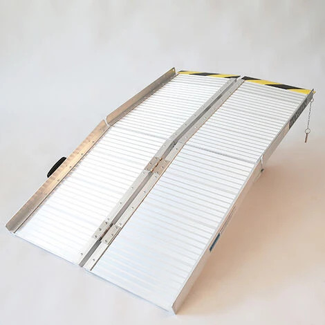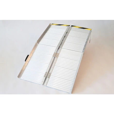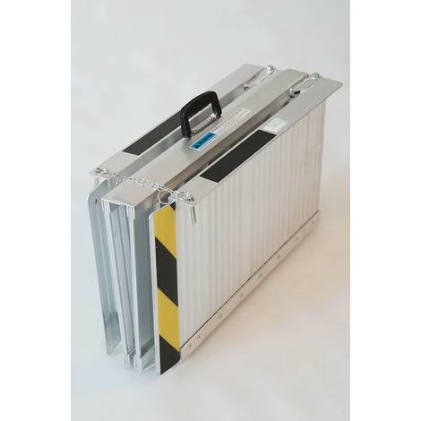 – Doppelt faltbare Rollstruhlrampe mit stirnseitigen Zugang und ergonomischem Tragegriff.