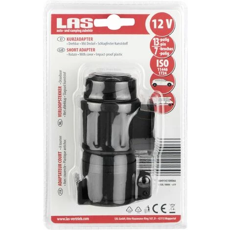 Der Kurzadapter von LAS dient zum Anschluss eines 7-poligen Steckers an einer 13-poligen Fahrzeugdose und versorgt somit den Anhänger mit Strom.Spannung: 12 VSteckverbindung: 13- auf 7- poligMaterial: KunststoffAusführung: drehbarentspricht DIN ISO 11446 und 1724
