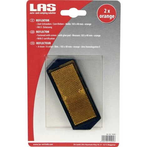 Der Reflektor von LAS dient zur Kennzeichnung des Anhängers. Sie steigern somit ihre Sichtbarkeit und senken das Unfallrisiko. Leichte Montage durch Schrauben oder Kleben.Maß: ca. 10,3 x 4 cm (L x B)zum Schrauben oder KlebenFarbe: orangerechteckigE-ZulassungLieferumfang: 2 Stück