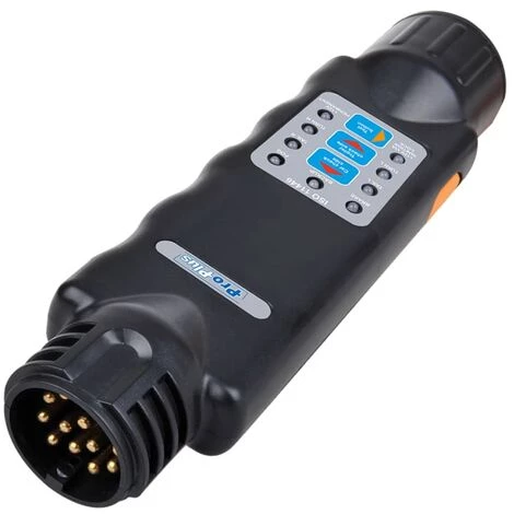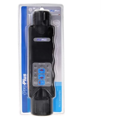 Mit diesem handlichen 13-poligen Steckentester 343543 von ProPlus können Sie Ihre Fahrzeugbeleuchtung überprüfen und sie mit der Ihres Anhängers synchronisieren. Zuerst können Sie das Testgerät an die Netzbuchse des Fahrzeugs verbinden. Dann schalten Sie die Zündung ein und testen Sie alle Funktionen, mit Hilfe einer zweiten Person. Wenn die Steckdose richtig zugeordnet ist, leuchtet die entsprechende Anzeige auf. (Wenn Sie die Fahrtrichtungsanzeige testen, wird das Licht auch blinken.)
