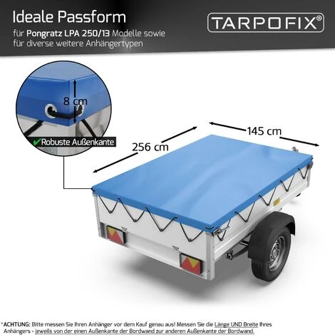 ✔ IDEAL PASSEND – die Hängerabdeckung passt ideal auf Pongratz LPA 250/13 Autohänger sowie auf diverse flache 1.000 kg und 1.350 kg KFZ Autoanhänger mit Kastenaußen Maß von 256×145!