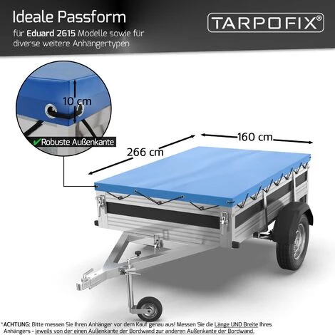 ✔ IDEAL PASSEND – die Hängerabdeckung passt ideal auf Eduard 2615 Autohänger sowie auf diverse flache 1000 kg und 1350 kg KFZ Autoanhänger mit Kastenaußen Maß von 266×160!