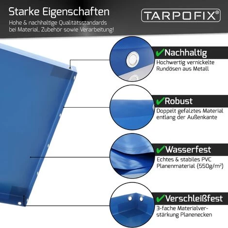 ✔ PREMIUM MATERIAL– Strapazierfähiges PVC Planen Material, ein extra robuster Ø8mm Gummizug sowie nachhaltige Ösen aus vernickeltem Metall – auch beim Zubehör der Abdeckplanen setzt Tarpofix auf höchste Qualität!