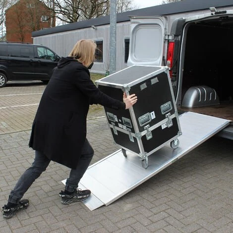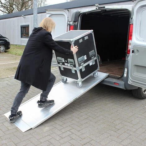 Sie können diese für Event- und Bühnentechnik, Industrie, Handwerk oder privat nutzen. Durch die breite Ausführung ist die Auffahrrampe sehr sicher zum Verladen mit einem Plattformwagen, einer Sackkarre oder ähnlichen Transportmitteln geeignet..