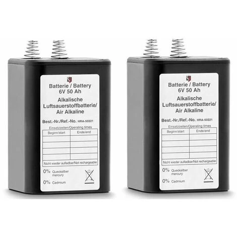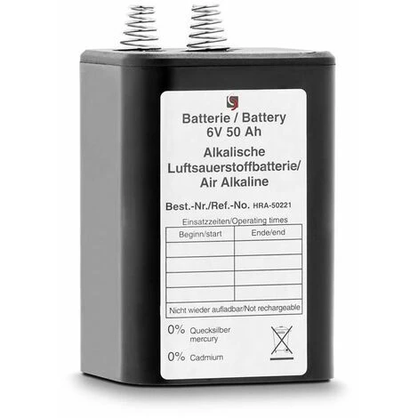IEC: 4R25X Spannung: 6 V Kapazität: 50 Ah System: Luft / Sauerstoff (Air Alkaline) – Batterie wird erst durch öffnen des Ventils aktiviert.