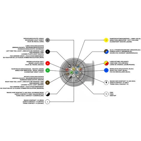 Damit Ihr Anhänger oder Trailer mit genügend Strom versorgt wird, kommt dieser 13-polige Anhängerstecker zum Einsatz. Neben den Grundfunktionen wie die Basisbeleuchtung, das Bremslicht sowie das Blinklicht, speisen die zusätzlichen Pole zum Beispiel die Nebelschlussleuchte und die Rückfahrleuchte mit Strom.