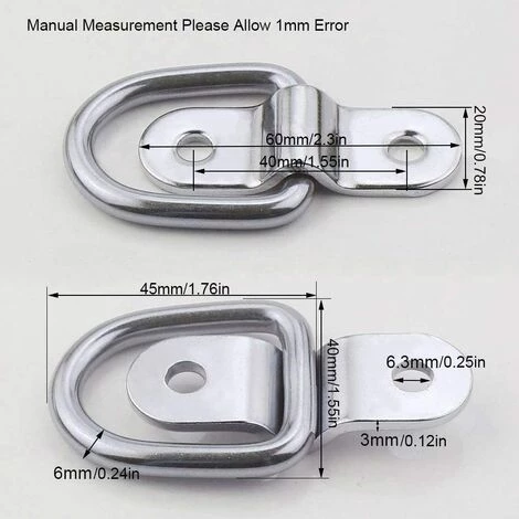 Der Haltegurt funktioniert gut auf allen Oberflächen und Böden. Diese D-Ringe werden mit Montagewinkeln, aber ohne Schrauben geliefert. Die empfohlene Installation erfolgt mit runden Schrauben mit einem Durchmesser von 1/4 „“, die in die 9/32 „“ Löcher in den Montageklammern passen.